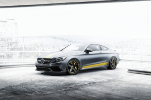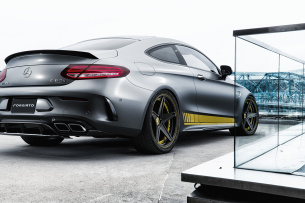 Sehr rasant und rassig schaut die Farbkombination in designo selenitgrau magno mit gelber Folierung aus. Noch rauer und rassiger kommt die optische Aufmachung des zweitürigen C-Klasse-Geschosses mit den TEC 2.6 Rädern im klassischen Fünfspeichendesign im schwarzen und gelben Farbmix von Forgiato ins Rollen. Die Tecnica Series von Forgiato ist eine neue Räderlinie des US-Felgenherstellers. Am C63 S sind sie im Format 19 Zoll montiert. (Bilder: Forgiato)