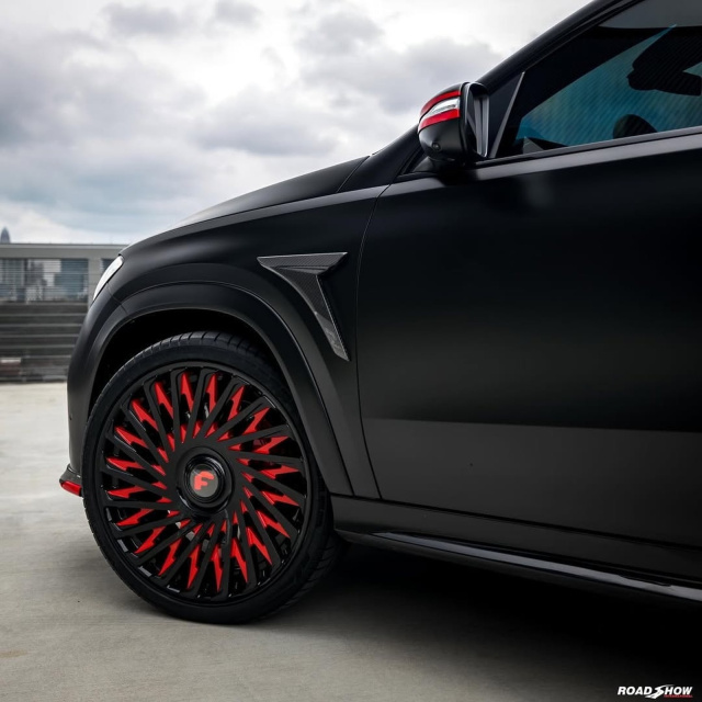 Rundum 20 mm tiefer gelegt rollt das souverän-stattliche Sport-SUV auf 24-zölligen Forgiato-Tessuto-Rädern an. Das schwarze Finish mit den roten Akzenten der interessant gestylten Felgen passt ausgezeichnet saowohl zum Exterieur (wo sich auch rote Aktente wiederfinden) als auch zum Interieur des GLE.