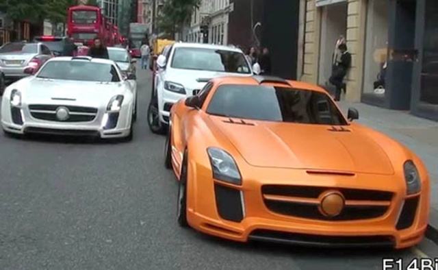 Gullwings im Doppelpack: Der eine Mercedes AMG Supersportwagen ist weiß. Der andere orange. Beiden ist gemeinsam, dass sie in London ihre Kreise drehen und aus der Werkstatt des Schweizer Tuners FAB Design stammen. X2 heißt das alles andere als dezente Modell, welches FAB Design in einer auf 25 Exemplare limitierten Kleinserie aufgelegt hat. Und zwei davon kreuzen am selben Ort auf! Was lernen wir daraus? Erstens die Welt ist ein Dorf. Und zweitens: Guter Geschmack macht nicht einsam.