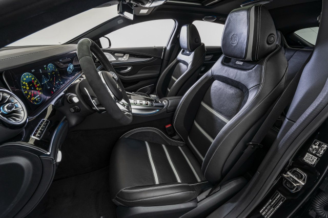 Was hat das viertürige AMG-GT-Coupé von BRABUS noch zu bieten? Aufregende Optik dank sportlich gestylter Sicht-Carbon Aerodynamik-Komponenten natürlich sowie Hightech-Schmiederäder im neuen BRABUS Monoblock Z „PLATINUM EDITION“ Zehnspeichendesign in einer ungewöhnlichen Kombination mit 21 und 22 Zoll Durchmesser für Vorder- und Hinterachse. Mit an Bord ist die BRABUS AIRMATIC SPORT-Unit. Das Modul wird in Plug-and-Play Technologie an die Luftfederung adaptiert wird und legt das viertürige Coupé in den beiden Fahrmodi „Komfort“ und „Sport“ um ca. 25 Millimeter tiefer.