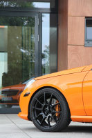 Abgerundet wird die Optik durch einen sportlichen, ebenfalls schwarz ausfallenden Radsatz, vorne in 8,5x20" mit 255/30 ZR20 und hinten in 11x20" mit 305/25 ZR20, sowie einem speziellen Bodykit. Die seitliche Ansicht verbirgt die schiere Breite der hinteren Reifen eindrucksvoll, stellt man sich aber genau hinter den X-Orange entdeckt man eine brachiale Breite der Heckpartie.