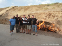 Am vergangenen Samstag wurde die letzte Etappe mit den E-Klasse Kombis gleich mit einer guten Tat gestartet. Ganz in der Nähe, in Bazar, hatte sich nämlich ein Erdbeben ereignet und so entschied sich das Team alle Kleidungsstücke und Ausrüstungsgegenstände, die ab Baku nutzlos sein würden, bereits hier los zu werden! Mit Hilfe eines fließend Englisch sprechenden Soldaten konnte die Verteilung der "sieben Sachen" schnell organisiert werden. Kurz vor der Einfahrt nach Baku musste noch schnell eine weitere Sonderprüfung abgelegt werden, die mit dem Entflammen einer in Bulgarien gekauften Zigarre am "brennenden Berg" souverän gemeistert wurde!