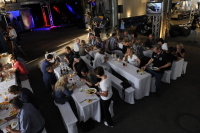 Zurück im Hotel machten sich dann alle frisch und am frühen Abend trafen dann alle wieder pünktlich auf dem Gelände ein, wo die Party startete. Die Halle, in der sonst Anhänger gebaut werden, war nicht wiederzuerkennen. Es gab eine große Bühne, einen Lounge-Bereich, Tische und Bänke für das Essen, einen Barbereich, ein DJ legte auf, es wurde die neue Club-Collection präsentiert, ein Safety-Car und ein SLS AMG strahlten im Scheinwerferlicht um die Wette und draußen wurde für alle Gäste gegrillt.