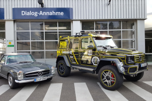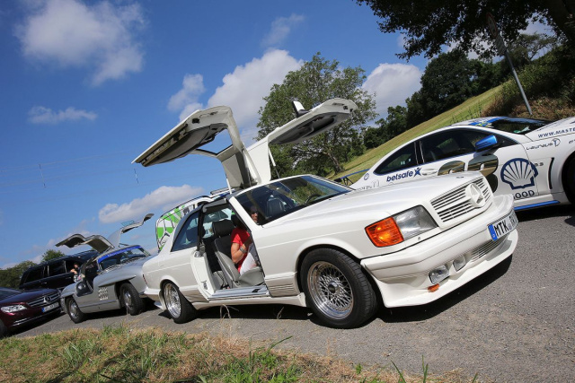 Ebenso bestaunt wurden der Dakar-Unimog von Jörg Sand und der Aicha des Gazelles Vito 4x4, mit dem Dr. Eva Holzhäuser und Nicole Marquardt erfolgreich in Marokko unterwegs waren. Ein Hingucker ist auch der 500 SEC Gullwing von Ralf und Irmgard Weber. Die Tuning-Ikone auf C126-Basis war aber an diesem Wochenende nicht der einzige Flügeltürer. Wie immer spektakulär der Auftritt von Ron Bussink und seinem Team Masters of Speed. Neben dem bereits erwähnten Brabus G 6000 hatte der Holländer auch noch mit dem C 63 in Laureus-Farben und dem G-Klasse Professionell zwei weitere Gumball erprobte Boliden dabei. Ergänzt um eine wunderschöne Pagode mit V8-Treibsatz.