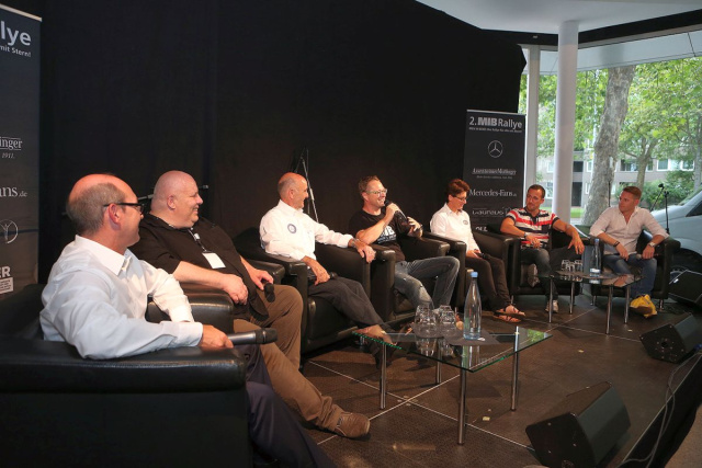 Gelegenheiten zum Gespräch ergaben sich jedenfalls genügend. Der Rallye-Vorabend startete bei Mercedes-Benz Partner AssenheimerMulfinger in Heilbronn. AssenheimerMulfinger-Geschäftsführer Marcel Stadtmüller erwies sich erneut als perfekter Gastgeber. In der kurzen Talkrunde begrüßte Moderator Dirk Krühler prominente Starter wie z.B. die ehemalige DTM-Pilotin und jetzige Race-Truckerin Ellen Lohr und Lance David Arnold, Dritter beim diesjährigen 24 h Rennen auf dem Nürburgring mit dem Haribo-AMG GT. Überraschungsgast Robert Schäfer berichtete von den Weltrekordfahrten im 190 E 2.3-16, die 1983 in Nardo stattfanden und teilweise noch heute Bestand haben. Robert Schäfer war einer von sechs Fahrern, die diese Rekorde aufgestellt haben