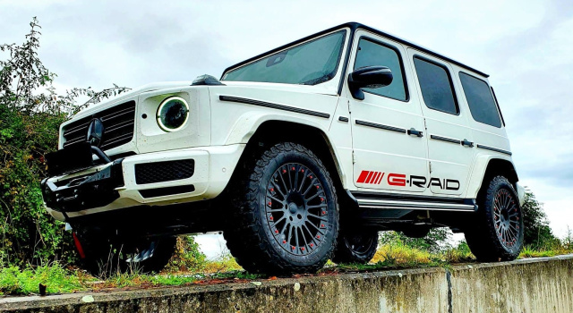 Dieser Mercedes-Benz G 350d wurde von der GFG Gesellschaft für Geländewagen mbH zum schicken Offroader umgebaut. Die G-Klasse kommt mit einer G-Raid-Höherlegung, einer Frontwinde und den brandneuen G-Raid-Felgen. Die sogenannte "Forged S One"-Felge ist made in EU und verhilft dem G optisch zu einem deftigerem Offroad-Look. Die geschmiedete Alufelge in schwarz ist in den Größen 18-Zoll ET43 und 20-Zoll ET33 erhältlich. Die Traglast beträgt 1.150 Kilogramm. Die Motorleistung des G 350d wird übrigens über eine Neungang-Automatik an die beiden Achsen geleitet, wovon 40 Prozent nach vorne und 60 Prozent an die Hinterachse transferiert werden. Serienmäßig an Bord: eine Untersetzung und einzelne Sperren für den harten Einsatz abseits befestigter Pisten sowie die fünf anwählbaren Fahrprogramme, mit denen sich die Charakteristik auf Knopfdruck in Sekundenschnelle anpasst, in dem Motor, Getriebe, Fahrwerk und Lenkung verändert werden.(Foto: GFG Gesellschaft für Geländewagen mbH)