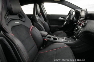 Auch innen fasziniert der neue A 45 AMG mit den für Mercedes-AMG typischen Charaktermerkmalen Dynamik und Exklusivität. Die Sportsitze in Leder-nachbildung ARTICO/Mikrofaser DINAMICA mit roten Kontrastziernähten, das Multifunktions-Sportlenkrad mit Schaltpaddles und die AMG DRIVE UNIT setzen in optischer wie qualitativer Hinsicht neue Maßstäbe. Das Zierelement der Instrumententafel ist in Carbonoptik ausgeführt perfekt dazu passen die fünf Lüftungsdüsen in Schwarz/Rot, die roten Sicherheitsgurte und die AMG Einstiegsschienen. Das AMG Kombiinstrument informiert mittels zentralem Farbdisplay mit dem AMG Hauptmenü und dem RACETIMER.