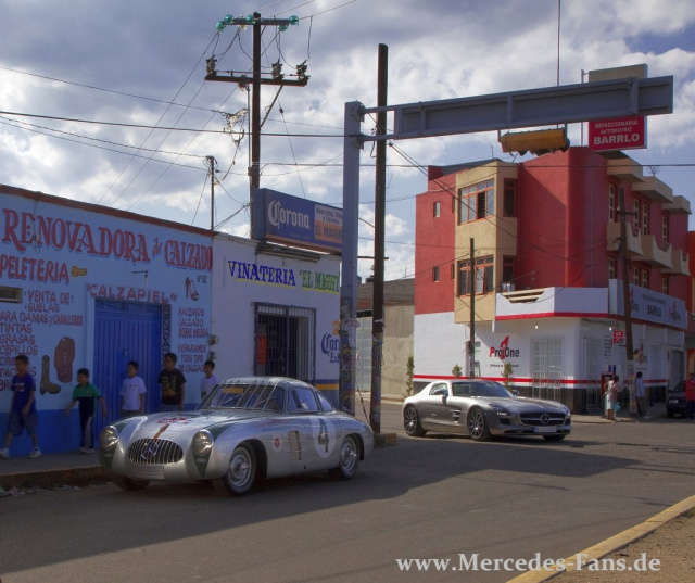 Nicht um den Rekord zu brechen, sondern um an die legendäre .3. Carrera Panamericana Mexico im November 1952 zu erinnern, hat nun ein Rennsportwagen vom Typ 300 SL (Baureihe W 194) die Ausstellung Rennen und Rekorde des Mercedes-Benz Museums in Stuttgart für kurze Zeit verlassen. Begleitet wird er dabei vom legitimen Nachfolger SLS AMG, von dem man seit heute weiß, dass er nicht nur optisch, sondern auch unter sportlichen Gesichtspunkten in die Fuß-Stapfen des Mercedes 300 SL treten möchte. Der GT3 bringt alles mit, um in seiner Klasse ein ebenso leistungsfähiger wie spektakulärer Wettbewerber zu sein. Ja, AMG macht bei seinem Flügeltürer alles richtig. Das klingt schon jetzt nach einer tollen Story! Und wenn man in die Glaskugel schaut, dann ahnt man, da ist kein Ende abzusehen