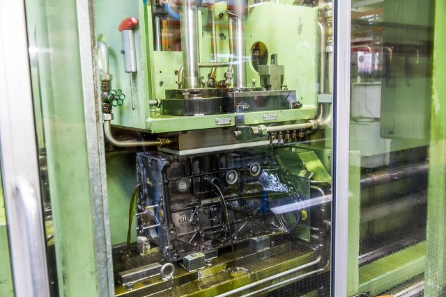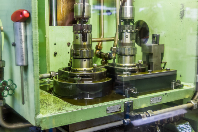 Mit einem sogenannten Vor-Honer und einem Fertig-Honer wird der Motorblock hinter einer Sicherheitsscheibe bearbeitet. Dazu fahren die Werkzeuge im Zylinder auf und ab, während sie eine Drehbewegung ausführen. Der Vor-Honer kommt zum ersten Arbeitsschritt zum Einsatz, danach folgt der Fertig-Honer zum Abschluss.