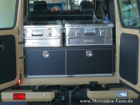 Zum serienmäßigen 96-Liter-Kraftstofftank hat man dem Geländewagen noch zwei Zusatztanks spendiert. Einen fest eingebauten unter der hinteren Sitzbank (Fassungsvermögen 64 Liter) und einen weiteren, der montiert werden kann, wenn auf der Rückbank keine Passagiere mitreisen (Fassungsvermögen 70 Liter). Die beiden Zusatztanks werden mit einer elektrischen Pumpe aus dem Haupttank gefüllt. So ausgestattet bietet der G eine Tankkapazität von 230 Liter Treibstoff, das sollte für eine Reichweite von rund 1.500 Kilometer genügen. Öl nimmt ein speziell konstruierter Tank auf, der im Reserverad verstaut werden kann und der sieben bzw. neun Liter fasst. Dieser Tank kann ans Reserverad geschlossen und unter der Reserverad-Abdeckung verborgen werden. Bleiben wir bei den Tanks: Der Trinkwassertank hat ein Volumen von 88 Litern, der Wasserhahn ist am hinteren Stoßfänger untergebracht, zur leichten Wasserentnahme und zur schnellen Kopplung mit einem Duschkopf. Das alles ist durch eine spezielle Plattform verborgen, die den Tank aufnimmt und problemlos eine Beladung des Kofferraums erlaubt. Für Komfort während der Fahrt sorgt eine Klimaanlage. Die Basis wurde dann von Unicat, seit langen Jahren erfahren in der Entwicklung und Fertigung von einmaligen Expeditions-Mobilen, mit weiterem Zubehör aufgerüstet.