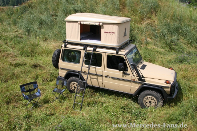 Das Dachzelt stammt vom italienischen Hersteller Autohome, der mit seinen Maggiolina Dachzelten bekannt geworden ist. Das auf dem G montierte Dachzelt besitzt in Wagenfarbe gehaltene Dachschalen aus Carbonfiber, Gewichtsreduzierung und Robustheit standen bei der Wahl des Materials im Vordergrund. Aus dem gleichen Material besteht auch die Einstiegsleiter, welche die serienmäßig aus Alu gefertigte Leiter ersetzt.