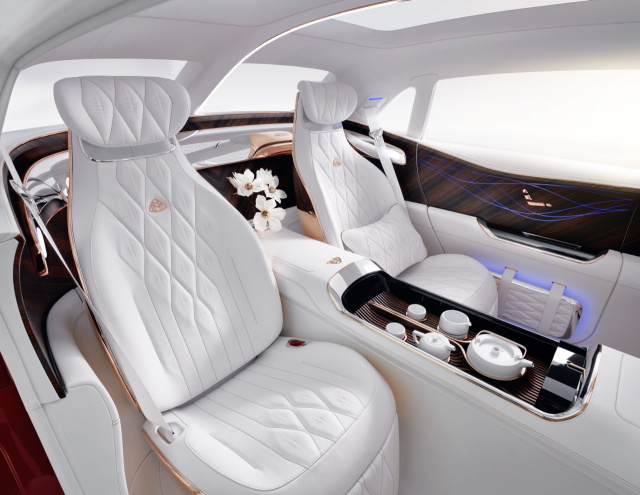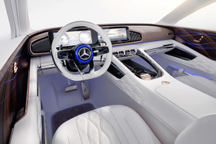 Das Interieur des Vision Mercedes-Maybach Ultimate Luxury inszeniert einen spannenden Kontrast zwischen hoher sportlicher Ausrichtung und luxuriöser Weite. Dieses Showcar ist die ultimative Verkörperung eines Luxus-Traumautos. Da der Vision Mercedes-Maybach Ultimate Luxury primär für den Chauffeurbetrieb konzipiert ist, ist sein Design stark auf die Passagiere im Fond und deren Wohlbefinden ausgerichtet. Dort ist das wohnliche Raumgefühl besonders intensiv erlebbar.