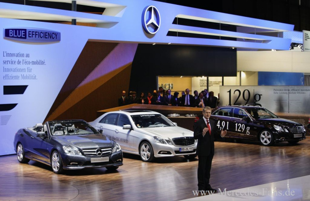 Seinen konsequenten Effizienzkurs bestätigt Mercedes-Benz auf dem Genfer Salon mit zwei neuen Serienmodellen: Der E 250 CDI BlueEFFICIENCY verbraucht 4,9 statt 5,8 l/100 km, sein CO2-Ausstoß reduziert sich damit von 154 auf 129 g/km (vorläufige kombinierte Werte). Der C 220 CDI BlueEFFICIENCY begnügt sich mit 4,5 l/100 km (119 g CO2/km). Beide Modelle erhalten eine spezielle Start-Stopp-Automatik in der E-Klasse zum ersten Mal in Verbindung mit dem weiterentwickelten 7-Gang-Automatikgetriebe.