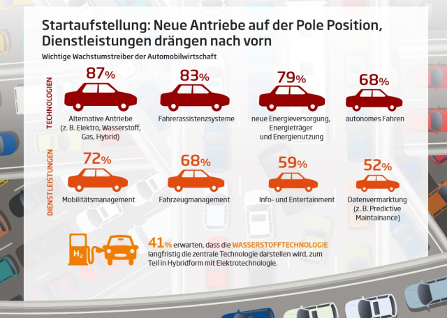 Mit dem Durchbruch alternativer Antriebstechnologien wird künftig ein großer Teil klassischer Einnahmequellen in der Automobilbranche wegbrechen. Im Elektroauto ist ein Bruchteil der Teile verbaut, die heute ein Benzin- oder Dieselfahrzeug benötigt. Dazu kommt, dass batterie- oder gasbetriebene Kfz weniger bewegte Teile haben. Das schmälert das Aftersales-Service-Geschäft. Hierfür suchen die Unternehmen händeringend nach Ersatzgeschäft und neuen Standbeinen. Als Kompensation rücken viele Autohersteller und Zulieferer enger an das Energiegeschäft heran. 79 Prozent der befragten Entscheider arbeiten an Konzepten, um künftig mit der Energieversorgung, der Energieproduktion und der Energienutzung neues Wachstum zu erzielen. Für den Ausbau des Strom- und Gastnetzes entstehen neue Kooperationen mit Energieunternehmen, Tankstellenbetreibern und Dienstleistern wie Hotel- und Restaurantketten. Ziel ist, die Dichte der Ladestationen und damit die Attraktivität deutlich zu erhöhen.