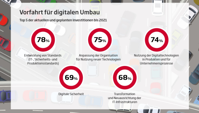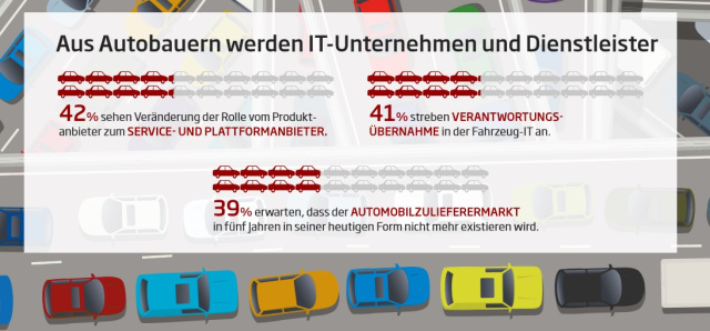 Darüber hinaus wollen die Entscheider der Automobilindustrie das Geschäft mit Technologien ausbauen, die das Fahren digitaler und damit komfortabler und sicherer machen. 83 Prozent der Unternehmen setzen auf Fahrassistenzsysteme, 62 Prozent auf so genannte Well-being-Komponenten. Dazu gehören Messinstrumente, die auf Wunsch Vitaldaten des Fahrers im Blick behalten und beispielsweise bei Anzeichen von Müdigkeit Alarm schlagen. Für 68 Prozent der Branchenvertreter ist zudem die Entwicklung teil- oder vollautonomer Fahrzeuge ein relevantes Geschäftsfeld, das sie vorantreiben wollen.