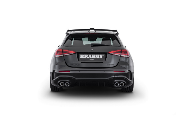 Ebenso sportlich präsentiert sich die Optik des von BRABUS veredelten Mercedes-AMG A 35 4MATIC: Der zweiteilige BRABUS Frontspoiler ist so konzipiert, dass er links und rechts am unteren Teil der Serienschürze fixiert wird. Um den Fahrtwind optimal in die seitlichen Lufteinlässe am Frontstoßfänger zu leiten, gibt es die beiden BRABUS Elemente, die über den horizontalen Stegen der seitlichen Belüftungsöffnungen angebracht sind. Für eine optimale aerodynamische Balance und eine noch aufregendere Rückansicht sorgt der BRABUS Heckflügel auf dem Dach, der den Serienheckspoiler ersetzt.