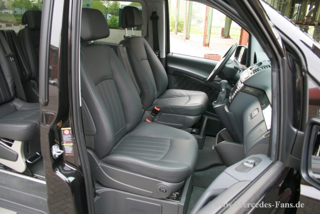 Unser Testwagen kommt mit sechs eleganten Einzelsitzen mit anthrazit-farbenen Leder Lugano und einem grauen Armaturenbrett mit schwarzen Wurzelnuss-Optik-Elementen. Die vier hinteren Sitzen lassen sich in Längsrichtung verschieben und auch um 180° verdreht einbauen, so das man auf Wunsch mehr Gepäckraum erhält oder auch eine Vis-a-Vis-Situation bekommt. Der Einstieg hinten erfolgt über eine der beiden elektrisch angetriebenen Schiebetüren, vorne öffnen die beiden Türen wie gewohnt und laden mit glänzenden Mercedes-Benz Zierleisten zum Einstieg ein.