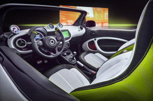 Einen eleganten Touch geben die in der Tür nahtlos versenkten Türgriffe. Lackiert ist der smart forease in einem effektreichen metallic-weiß. Einen feinen Kontrast dazu bieten die matt-silberne Tridion-Zelle und die Akzente in leuchtendem „stream green“ innen wie außen. Durch das offene Fahrzeugkonzept werden Exterieur und Interieur miteinander verknüpft, da stets das gesamte Farbspiel wahrgenommen wird. Somit trägt das Interieur zur Außenwirkung des Fahrzeugs bei. Auch technische Details des Innenraumes sind darauf ausgerichtet. Eine Besonderheit sind die beiden runden Displays anstelle der mittleren Luftdüsen in der Instrumententafel – für genügend Frischluft ist ja ohnehin gesorgt. Die Displays können zum Beispiel die Inhalte der “ready to“ App anzeigen, mit der man seinen smart mit Freunden teilen oder seine Funktionen überwachen kann. Die Lautsprecher der Audioanlage sind sichtbar in der Rückwand des Cockpits integriert und betonen den coolen spielerischen Charakter des Wagens.