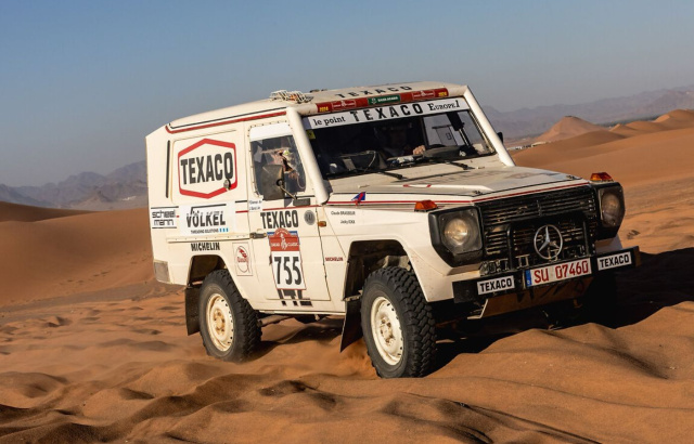 Dieses Jahr waren es drei Mercedes Geländewagen und zwei Mercedes Service Trucks. Bei der nächsten Ausgabe 2025 werden es auch wieder zwei Mercedes Service Trucks und ein Mercedes Geländewagen sein. Natürlich wieder die 83er Sieger-G-Klasse von Jacky Ickx.