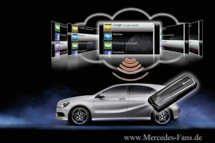 Der Schwerpunkt des neuen Zubehörprogramms liegt beim Infotainment. Mit der nahtlosen Integration des iPhones® ins Fahrzeug und dem revolutionären Grafikdesign bietet Mercedes-Benz der Generation Facebook in der neuen A‑Klasse ein Zuhause auf Rädern. Das Drive Kit Plus für das iPhone® bietet die eigens von Daimler entwickelte App Digital DriveStyle. Zu den Highlights zählen unter anderem die fortschrittliche Navigationslösung von Garmin® mit internetbasierten Echtzeit-Verkehrsinformationen, Online-Sonderzielsuche inklusive Street View Ansicht und 3D-Kartendarstellung. Weitere Funktionen sind Facebook®, Twitter® und AUPEO! Personal Radio.