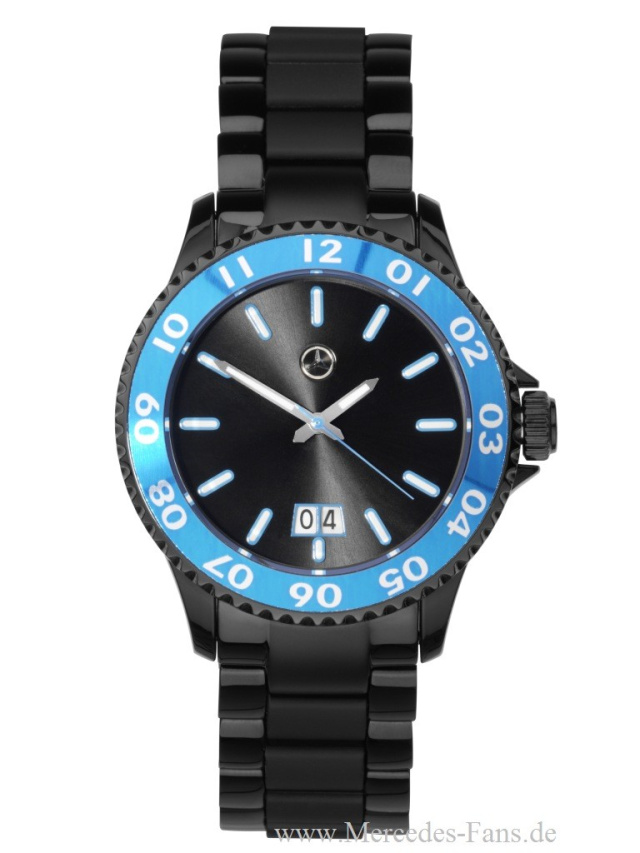 Mit ihrer südseeblauen Aluminium-Lünette greift die Armbanduhr eine andere populäre Farbe der neuen A-Klasse auf. Die sportliche 3-Zeigeruhr (129,90 Euro) besitzt ein Armband aus Edelstahl und gummiertem Kunststoff in Matt/Glanz-Optik sowie eine große Datumsanzeige. Eine originalgetreue Nachbildung der 18"-Felge im Maßstab 1:18 ist der A-Klasse Schlüsselanhänger aus Edelstahl. Das Rad im modelltypischen Fünf-Doppelspeichen-Design ist mit einer Kette am Flachspaltring befestigt. Drei kleine Spaltringe erleichtern das Herausnehmen und Auswechseln der Schlüssel. Preis: 29,90 Euro.