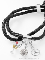 Sportlich und chic zugleich wie die neue A-Klasse ist auch das Armband mit Charms (69,90 Euro). Das zweireihig geflochtene Armband besteht aus schwarzem Rindsleder und besitzt einen Knebelverschluss. Die drei Charms ein durchbrochener Mercedes-Stern, eine Discokugel mit CRYSTALLIZED Swarovski Elements sowie ein stilisiertes Cocktailglas bestehen aus Edelstahl.