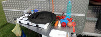 Staukisten gibt es auf der Fahrerseite mittig und auf beiden Fahrzeugseiten am Heck. Sie nehmen Werkzeug und den diversen Kleinkram auf, der auf Reisen unabdingbar mit dabei sein muss. Weniger schwere Utensilien können in einer aus Riffelblech gefertigten Staubox vorne am Alkoven verstaut werden, abschließbare seitliche Klappen erlauben den Zugang. Ein links der Einstiegstür montierter Klapptisch aus Riffelblech, eingehängt in VA-Scharniere, leistet bei "outdoor" eingenommenen Mahlzeiten gute Dienste.