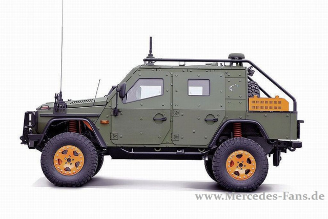 Basis des gepanzerten G-Modells (Radstand 2850 mm) ist der LAPV 5.4 , ein sogennantes Light Armoured Patrol Vehicle. Letzterem ist die Abstammung von der Mercedes-Benz G-Klasse direkt ins Gesicht geschrieben. Auch wenn die technisches Details nicht alle verraten wurden, so darf dennoch davon ausgegangen werden, dass unter der kantigen Karosse, die dank ihrer geraden Flächen nicht nur ein hohes Schutzniveau bietet, sondern auch leicht zu reparieren ist, ein drehmomentstarker Common-Rail-Diesel steckt. Dieser soll das über gegenüber dem LAPV 5.4 um einige 100 kg abgespeckte Fahrzeug auf über 150 km/h beschleunigen!