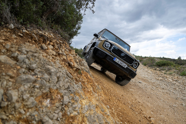 Was der Einzelradantrieb auch möglich macht, ist ein intelligentes Kriechen im Gelände. So sind drei verschiedene Geschwindigkeiten zwischen zwei und acht km/h einstellbar, mit denen sich der Stromer seinen Weg eigenständig durchs Gelände bahnt. Der Fahrer muss nur noch lenken. Das funktioniert auf ebener Erde ebenso, wie bei Auf- oder Abfahrten. Zwischen den Achsen gibt Mercedes die Bodenfreiheit mit mindestens 250 mm an. Die Funktion einer herkömmlichen Differenzialsperre wird virtuell durch ein intelligentes Torque Vectoring erzeugt. Ganz neue Optionen eröffnet der Elektroantrieb auch bei Wasserdurchfahrten. Links und rechts schwappt die braune Brühe fast bis zur Fensterkante, vorne ragen gerade noch die Motorhaube und die beiden Blinker-Höcker aus dem Wasser – die G-Klasse rollt unbeeindruckt zum Ufer. Die elektrische Version hat eine maximale Wattiefe von 840 mm – 150 mm mehr als die Version mit Verbrennungsmotor. Der Grund: Die herkömmlichen Motoren ziehen Luft an – nicht so gut, wenn Wasser in die Ansaugung dringt. Den Elektromotoren ist das egal: Sie brauchen keine Luft und sind ansonsten gegen Wasser gut geschützt.