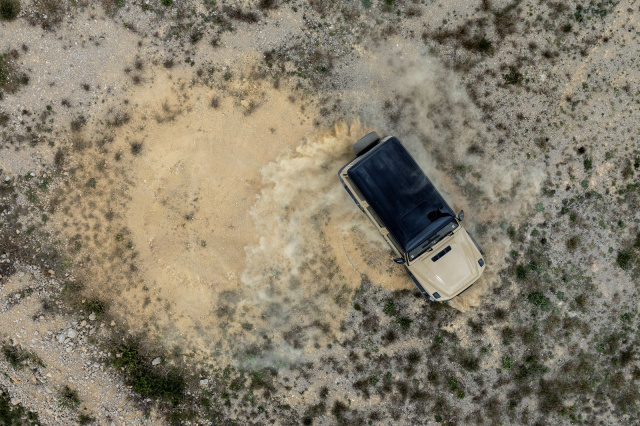 Die Räder der elektrischen G-Klasse werden jeweils von einem eigenen radnahen Motor individuell angetrieben. Die vier Motoren sind im Leiterrahmen integriert und sitzen zu zweit jeweils in einem Gehäuse an der Vorder- und Hinterachse. Zusammen kommen sie auf eine Leistung von 432 kW. Das entspricht gut 587 PS. Dazu kommt ein riesiges Drehmoment von 1.164 Nm. Das alles liegt ab der ersten Umdrehung an und sorgt dafür, dass man praktisch überall durchkommt. Auf der Straße beschleunigt der Koloss in 4,7 Sekunden von Null auf 100 km, bei 180 km/h wird elektronisch abgeregelt. Das Konzept der separat angetriebenen und ansteuerbaren Räder bietet vor allem im Gelände immense Vorteile. So lässt sich zum Beispiel je nach Untergrund und Schlupf jedes Rad elektronisch einzeln regeln – ideal zum Beispiel bei steinigen Aufstiegen oder im Schlamm. Außerdem ermöglicht es bisher ungeahnte Fahrmanöver. Vor einer Spitzkehre etwa genügt der Druck auf den Steering-Knopf im Cockpit. Beim Einlenken in die Kurve wird dann das Hinterrad in der Kurvenseite komplett abgebremst, der Wendekreis geht fast gegen Null und die Kehre lässt sich in einem Stück bewältigen. Eine herkömmliche G-Klasse schafft solche Kurven nur mit mehrmaligem Rangieren. Etwas weniger erschließt sich der praktische Sinn einer weiteren Option: Ebenfalls auf Knopfdruck lässt sich der Elektro-G auf der Stelle drehen – wenn der Untergrund locker ist. Erreicht wird das, indem sich die Räder gegenläufig drehen – ähnlich wie bei einem Panzer. Abgesehen davon, dass die Aktion einen heiden Spaß macht und für ein leichtes Schwindelgefühl sorgt, bleibt abzuwarten, wozu das teuere Karussell noch taugt. U-Turn im Gelände vielleicht, wenn es geradeaus nicht weiter geht. Oder es wird demnächst in einem neuen James-Bond-Film auftauchen. Spektakulär genug ist es ja.