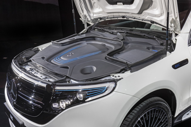 Der EQC besitzt als erster Mercedes-Benz Vertreter der neuen Produkt- und Technologiemarke EQ ein komplett neu entwickeltes Antriebssystem. Er trägt an Vorder- und Hinterachse je einen kompakten elektrischen Antriebsstrang (eATS) und hat damit die Fahreigenschaften eines Allradantriebs. Die intelligente Steuerung erlaubt über einen weiten Betriebsbereich eine dynamische Momentenverteilung zwischen den beiden angetriebenen Achsen und schafft so die Voraussetzungen für hohe Fahrdynamik. Die Asynchron-Maschinen haben eine gemeinsame maximale Leistung von 300 kW (408 PS). Kernstück des Mercedes-Benz EQC ist die im Fahrzeugboden angeordnete Lithium-Ionen-Batterie aus eigener Produktion. Mit 80 kWh (NEFZ) Energieinhalt versorgt sie das Fahrzeug unter Einbeziehung einer ausgeklügelten Betriebsstrategie und soll so eine elektrische Reichweite von über 450 km (nach NEFZ) ermöglichen. Die E-Maschinen werden sowohl in ihrer Antriebs- als auch in ihrer Rekuperationsfunktion drehrichtungsunabhängig betrieben und eingesetzt. Bei schwacher bis mittlerer Last wird aus Effizienzgründen nur die vordere E-Maschine betrieben. Die maximale rekuperative Verzögerung wird durch den Einsatz beider E-Maschinen als Generatoren erzielt.