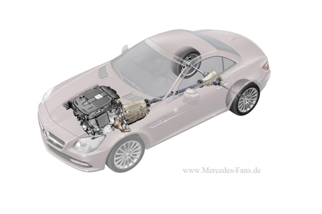 Die Vierzylinder-Triebwerke des neuen SLK folgen dem Konzept des sogenannten Downsizing: Den reduzierten Hubraum gleichen eine homogene Direkteinspritzung und Abgasturboaufladung aus. Daraus ergeben sich Vorteile wie vermindertes Gewicht und ebenfalls verminderte innere Reibung. Außerdem verlagert ein kleinerer Motor den Betriebsbereich im Kennfeld hin zu günstigeren Werten. Dies kommt ebenfalls dem Verbrauch zugute. Die Direkteinspritzung der Vierzylinder arbeitet mit einem Einspritzdruck bis zu 140 bar. Dadurch lässt sich zugunsten eines verbesserten Wirkungsgrades die Verdichtung gegenüber einer konventionellen Kanaleinspritzung anheben. Außerdem senkt der direkt im Brennraum verdampfende Kraftstoff die Temperatur im Brennraum und verringert dadurch die Klopfneigung des Motors. Betrieben wird der Motor im homogenen Betrieb.