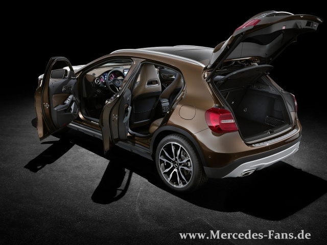 Die Wertigkeit der Sport-Sitzanlage unterstreicht der Durchbruch im unteren Kopfstützenbereich. Diese Öffnung ist auf der Rückseite der Vordersitze mit einem Rahmen in Silvershadow eingefasst und lässt sich auf Wunsch ambient beleuchten. Neben den Ausstattungspaketen Style, Urban, AMG und Exklusiv wird ein SUV-Style-Paket angeboten, das den SUV-Charakter des GLA nochmals unterstreicht. Highlight ist eine robuste, farbig kontrastierte Mokassin-Ziernaht an der Außenkontur der Sitze. Die Sitzlehne der Fondsitzbank lässt sich, sofern das optionale Laderaum-Paket geordert wurde, in eine steilere, so genannte Cargo-Stellung bringen. Dann vergrößert sich das Gepäckraumvolumen um 60 Liter und bietet Platz für sperrige Güter, während die Sitzbank aber trotzdem von Insassen genutzt werden kann.