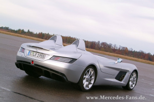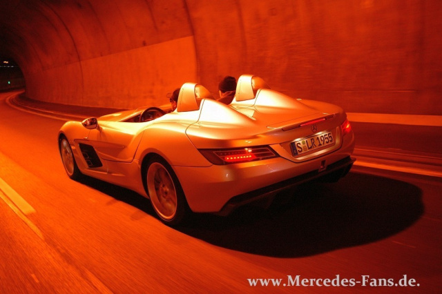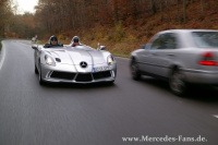 Der erste Aufgalopp ist vorsichtig aber gekonnt. Andreas hat den SLR fest im Griff, führt den SLR gut am Gas und fährt auch in den Kurven eine saubere Linie. Gut so, schließlich wurden von dem SLR Stirling Moss, der zugleich eine Reminiszenz an das Weltmeisterjahr 1955, die ewigen Mille Miglia Rekordzeit und eben an Stirling Moss, der diesen Rekord im damaligen SLR aufstellte, ist, nur 75 Exemplare gebaut. Jedes 750.000 EUR teuer, da wollen wir uns nicht in die Liste der prominentesten Testwagen-Zerstörungen eintragen.