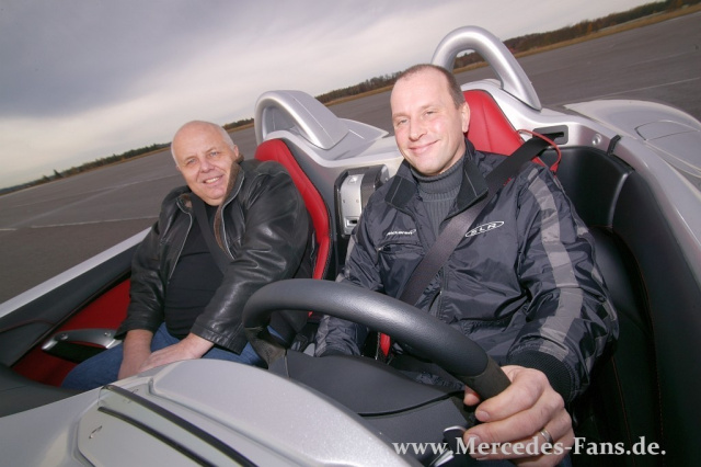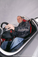 Nö, stattdessen kam eine schwarze V-Klasse im AMG-Look. Am Steuer Andreas Möller, der Gewinner des SLR-Gewinnspiels. Der Gastronom aus Pforzheim ist perfekt vorbereitet: Ich habe mir bei meinem Mercedes-Händler schnell noch eine original Mercedes McLaren SLR-Jacke gekauft! Wenn ich schon mal in so einem Auto mitfahren darf, dann auch im korrekten Outfit! Andreas ist allen sofort sympathisch. Aber nicht nur wegen der tollen Windjacke, er ist ein netter Kerl. Ein echter Fan, die Glücksfee hat alles richtig gemacht. Dann machen wir ihm den Vorschlag, er solle sich mal für ein paar Erinnerungsfotos hinters Lenkrad des gerade mal 122 cm hohen Sportwagens schwingen! Der Mann ist sofort begeistert: Was ehrlich?! Super!