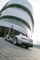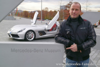 Auch im Stadtverkehr stellt der Hochleistungssportwagen unseren Gewinner vor keine Probleme. "Eigentlich verhält er sich so, wie ich es von einem Mercedes erwarten würde!", stellt Andreas fest, "die Lenkung ist recht stramm. Aber das ist eigentlich ganz gut so." Das Museum kommt in Sicht und wir dürfen den Stirling Moss direkt auf dem freien Vorplatz abstellen. Wir stehen keine 30 sekunden auf dem Vorplatz. Andreas stellt nach einem bedauernden tiefen Atemzug den V8 ab.