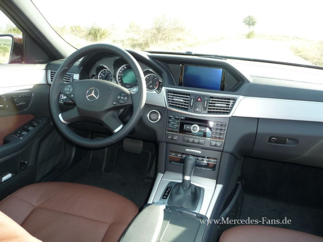 Gut gefallen hat uns zum gewählten Cupritbraun-Metallic die sattelbraune Lederausstattung des Avantgard-Pakets! Als gewöhnungsbedürftig wurde jedoch der vorgefundene Aktiv-Multikontursitz empfunden, der sich der Fahrerposition je nach Fahrsituation anpasst. Soll heißen: bei Kurvenfahrten justieren sich die Flanken der Sitze spürbar nach. Wer die E-Klasse eher zum Reisen denn zum Rasen nutzen will, sollte vielleicht besser zum Elegance-Paket greifen, das mit Bequemlichkeit auf höchsten Niveau bei ansprechendem Platzangebot verwöhnt. Übrigens, die Elegance-Polsterung mit ihren längs angeordneten Sitzpfeinen, orientiert sich an dem ebenso beliebten wie bewährten Mercedes-Sitzdesign aus den 60er- und 70er-Jahre.
