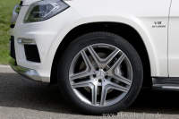 Die elektromechanische AMG Sport-Parameterlenkung verfügt über eine variable Servounterstützung, die je nach gewähltem Fahrwerkmodus agiert. Zudem hilft sie beim Kraftstoffsparen: Die Lenkunterstützung benötigt nur Energie, wenn der Fahrer auch tatsächlich lenkt. Serienmäßig rollt der GL 63 AMG auf titangrau lackierten und glanzgedrehten AMG Leichtmetallrädern im Format 10 x 21 im 5-Speichen-Design, auf denen Reifen der Dimension 295/40 R 21 montiert sind. Für kürzeste Bremswege und hohe Standfestigkeit sorgt die AMG Hochleistungs-Bremsanlage mit rundum belüfteten und perforierten Bremsscheiben im Format 390 x 36 Millimeter (vorne) und 345 x 26 Millimeter (hinten).