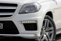 Markant, maskulin, unverwechselbar: Diese Attribute beschreiben das Design des GL 63 AMG. Die stilistischen Grundzüge des neuen GL kraftbetonte Dynamik und sportliche Eleganz ergänzt Mercedes-AMG um spezifische Elemente, die die besondere Performance des V8-Topmodells betonen. Die GL-typisch aufrechte Kühlermaske mit zentralem Mercedes-Stern zieren Hochglanz schwarz lackierte Lamellen. Zum AMG Styling zählt die Front-schürze, die mit großen Kühlluftöffnungen für eine effektive Anströmung der Kühlmodule sorgt. Am unteren Kühllufteinlass in Form des für AMG typischen stilisierten A befindet sich unter einer feinen schwarzen Finne ein Spalt, durch den die Luft optimal zu den Kühlmodulen strömen kann eine perfekte Verbindung von Design und Hightech. Die darunter angebrachte Zierspange in Silberchrom matt sorgt für Breitenwirkung und harmoniert perfekt mit den Einfassungen der LED-Tagfahrleuchten in den seitlichen Kühlluftöffnungen.