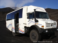 Die Unimog-Baureihe, die seit 2002 im Mercedes-Benz Werk Wörth produziert wird, bringt beste Voraussetzungen für den Einsatz unter härtesten Bedingungen auf dem Ätna mit: Das weltweit einzigartige Fahrzeugkonzept garantiert höchste Geländegängigkeit. Flexibler Leiterrahmen, Allradantrieb mit Differenzialsperren in beiden Achsen und Portalachsen, dazu die Reifendruck-Regelanlage Tirecontrol - jedes technische Detail leistet einen Beitrag dazu, dass das Universal-Motor-Gerät" der verlässliche Partner auf den Geröllpisten und Aschefeldern des höchsten aktiven Vulkans in Europa bleibt.