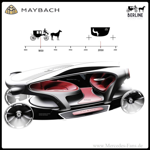 Die Maybach Berline wird wie eine Drohne via Satellit ferngesteuert, wodurch die Insassen maximalen Raum und absolute Privatsphäre genießen können. Der Chauffeur sitzt im Maybach Virtual Chauffeur Center und kann über einen, vom Fahrzeughimmel abgehängten Glas-Screen jederzeit angesprochen werden. Über diesen Bildschirm können auch alle erdenklichen Entertainment-Features abgerufen werden. Der mit viel Holz ausgestattete Innenraum ist wie eine Royal Lounge gestaltet, in der sich die Fahrgäste auf zwei komfortablen Einzelsitzen gegenübersitzen. Der Ein- und Ausstieg erfolgt, ähnlich wie in einem Business-Jet, über eine horizontal zweigeteilte Flügeltür, wobei der untere Teil zum Trittbrett ausgeklappt wird. Die Seiten der Kutsche haben übergroße Fenster, die auf Wunsch nur den Blick von innen nach außen zulassen und zusätzlich als weitere Interfaces genutzt werden können.