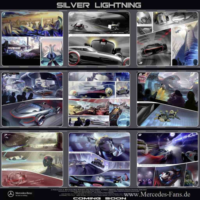 Die Handlung des Films Silver Lightning spielt in naher Zukunft, einem Zeitalter der künstlichen Intelligenz. Zwei Crashtest-Dummys namens Hans05 und Franz02 nehmen den Kampf gegen den Terrorherrscher Dr. Crash-Barrier auf, um ihren geliebten Mercedes Silberpfeil zu retten. Sie liefern sich ein actiongeladenes und nervenaufreibendes Duell mit dem unbarmherzigen Rammbock und besiegen ihn schließlich mit einer List. Der Silberpfeil ist eine tiefliegende Skulptur auf Rädern. Ein technischer Trumpf ist die diagonale, nabenlose Rollwalze, die das Lenken in alle Richtungen ermöglicht. Die Proportionen dieses futuristischen Silberpfeils erinnern an den legendären Rennwagen der späten 1930er-Jahre und den Uhlenhaut SLR aus den 1950er‑Jahren.