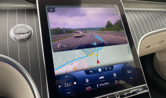 Bereits auf den ersten Metern in der C-Klasse gefällt uns ein Tool besonders gut: Dank Argumented Reallity wirkt das Navi nun noch zuverlässiger und übersichtlicher als jemals zuvor. Mittels Kamera wird ein Bild der Straße auf den großen Bildschirm übertragen und mit Pfeilen, die Straßenschildern ähneln, die Richtung klar angezeigt. So verpassen wir keine Ausfahrt mehr – prima! Und wer den Blick beim Fahren ungerne zur Seite auf das große Tablet richtet, der kann sich auch mittels Head-Up-Display komfortabel durch die Stadt navigieren lassen.