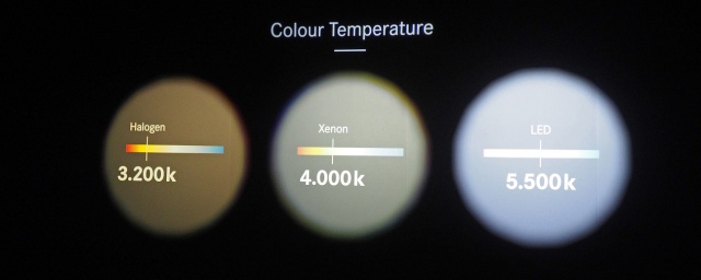 Allerdings wird das LED-Licht subjektiv als deutlich angenehmer empfunden und die Lichtverteilung ist homogener. Halogenlicht wird mit einer Farbtemperatur von 3.200 Kelvin als warm empfunden, Xenon-Licht (4.000 Kelvin) dagegen neutralweiß und kühl. LED-Licht wirkt mit 5.500 Kelvin noch kühler und wird vom Auge heller als Xenon- und wesentlich heller als Halogenlicht empfunden.