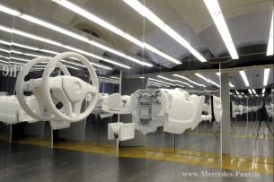 Hier im Spiegelraum kann man Bauteile der alten und neuen B-Klasse vergleichen