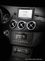 Die Lüftungsdüsen sind nun rund ausgeführt und erinnern im Design an die des SLS AMG oder SLK, die Düsenkreuze haben aber ihr eigenes Design, die Mercedes-Benz intern Butterfly genannt werden. Gleich fünf Stück erhielt die B-Klasse, drei davon sitzen dominant unter dem TFT-Monitor.
