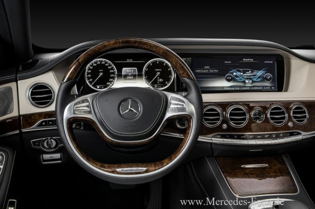 Hinter dem Zwei-Speichen-Lenkrad, einer Reminiszenz an die Heritage der S-Klasse, erstreckt sich als zentrales Element der horizontalen Ausrichtung das radikal neu gestaltete Display. Es löst das traditionelle Kombiinstrument ab und vereint zahlreiche weitere Funktionen auf optisch und ergonomisch höchst anspruchsvolle Weise (siehe Kapitel neues Anzeigekonzept). Die ganze Displayeinheit scheint zu schweben, dieser Eindruck wird durch die hinterlegte Ambientebeleuchtung noch unterstützt