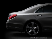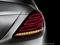Den krönenden Abschluss bilden die neuartigen Heckleuchten: Bei der neuen S-Klasse sind sie komplett vom Wagenkörper eingefasst und runden durch diese solitär integrierte Machart den Gestaltungsanspruch bis ins Detail ab. Ihr liebevoll gezeichnetes Innenleben zeigt den aktuellen Stand der Technik. Mit drei horizontal verlaufenden Lichtleitern lehnt es sich an die Mercedes-typischen Mäander an und reiht sich so lückenlos in die Ahnengalerie der Vorgänger ein. Nicht nur im Nacht- sondern auch im Tagdesign wird hier besonders die Liebe zum Detail mit höchsten technischen Ansprüchen verbunden. Die Nebelschlussleuchte ist im Stoßfänger mittig untergebracht und die Rückstrahler sind seitlich links und rechts formschön integriert.