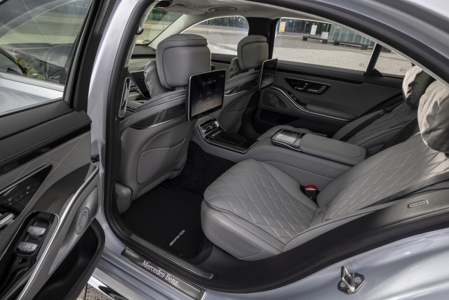 Auf den Rücksitzen wird dieses Gefühl nochmals getoppt. Mit der aufpreispflichtigen Einzelsitzanlage, die sich elektrisch zu einem echten Liegestuhl umfunktionieren lässt, bleiben dem geneigten Vorstandsvorsitzenden oder russischem Oligarchen garantiert keine Wünsche mehr offen, zumal mittels zwei eigenen 11,6 Zoll großen Bildschirmen die volle Kontrolle über das MBUX-System gewährleitet ist. Zudem befindet sich auf Wunsch auch noch ein 7 Zoll großes Samsung-Tablett zwischen den Sitzen.