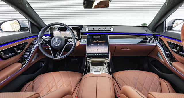 Endlich lassen sich auch in der zweiten Reihe die Bildschirme per Touch bedienen wobei die Bedienung ähnlich dem zentralen Hochkantdisplay in der Mittelkonsole ist. Die animierten Instrumente selbst könnten größer und insbesondere imposanter sein. Das kann auch der große Head-Up-Display (leider nur optional) nicht ausgleichen, das einem mit virtuellen Pfeilen den rechten Weg weist und ganz nebenher über alles wichtige informiert. Kritik gibt es auch am Lenkrad mit dem allzu berührungsempfindlichen Tasten auf den Speichen. Die Bedienung ist alles andere als eingängig und immer wieder rutscht man mit den Daumen einen oder zwei Menüpunkte zu weit und verpasst den rechten Druckpunkt. Angesichts des Perfektionsgrades des S-Klasse-Innenraums besteht hier allemal Verbesserungspotenzial. Das trifft nicht auf den Laderaum zu, der 550 Liter schluckt und damit der maximalen Zuladung von 700 Litern eine perfekte Heimat gibt.
